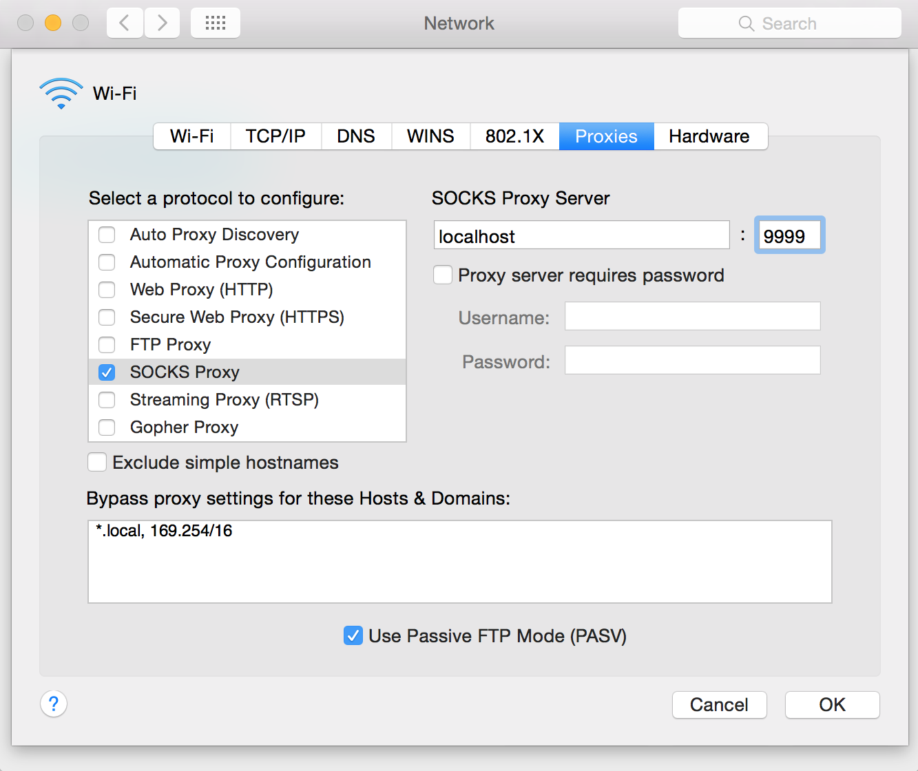 - Enable SOCKS Proxy and set server to ‘localhost’ with ‘9999’ as the port